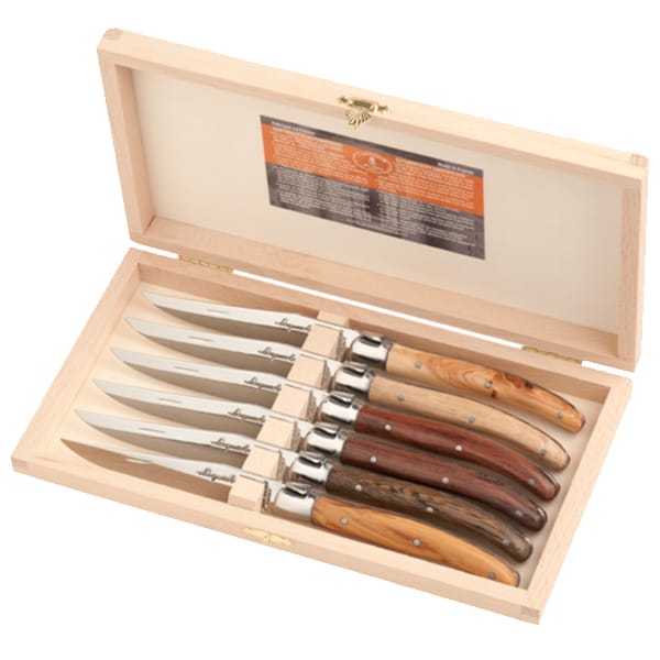 Set Laguiole de 6 cuchillos para corte de carne, hoja de acero y mango de madera : Wengue, Violeta, Bubinga o Mixtas (olivo, wengue, bubinga, violeta, roble, enebro).